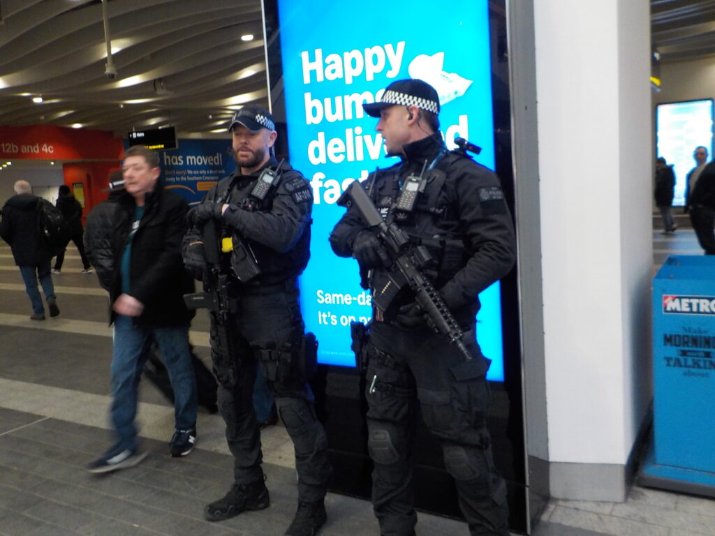 This human was passing through Birmingham New Street train station, several times recently, and on one occasion a group of policemen were out in high viz jackets, looking obvious and ready for action. Furthermore, two were armed with some sort of gun, this human is not familiar with armorment vocabulary, but it was a big gun, loaded, and ready for action if necessary.